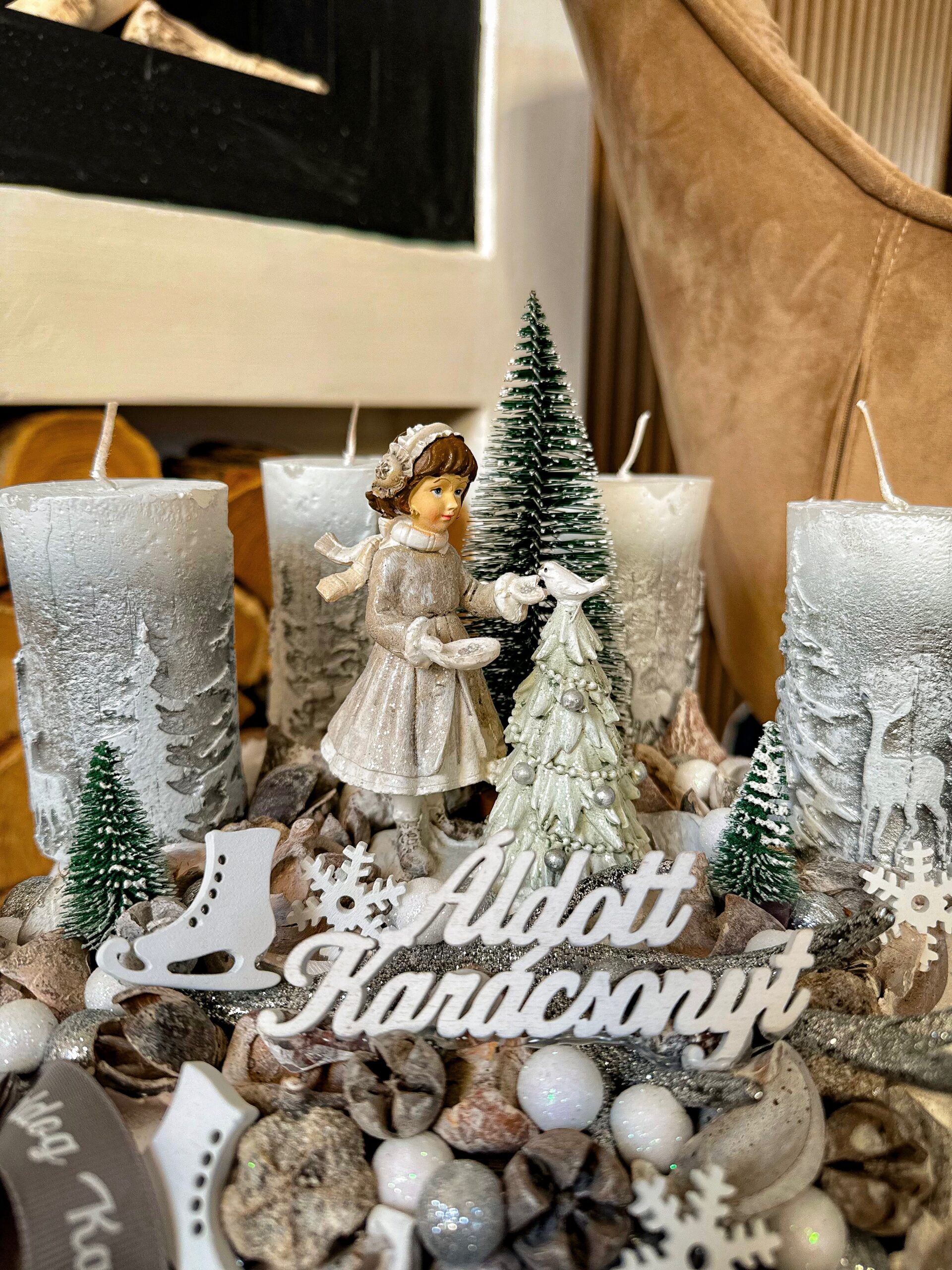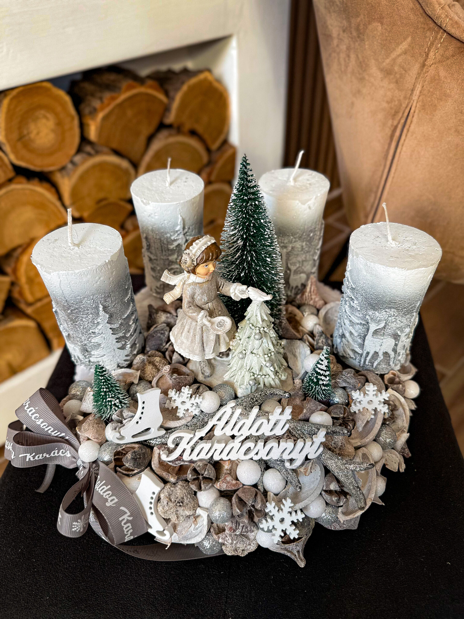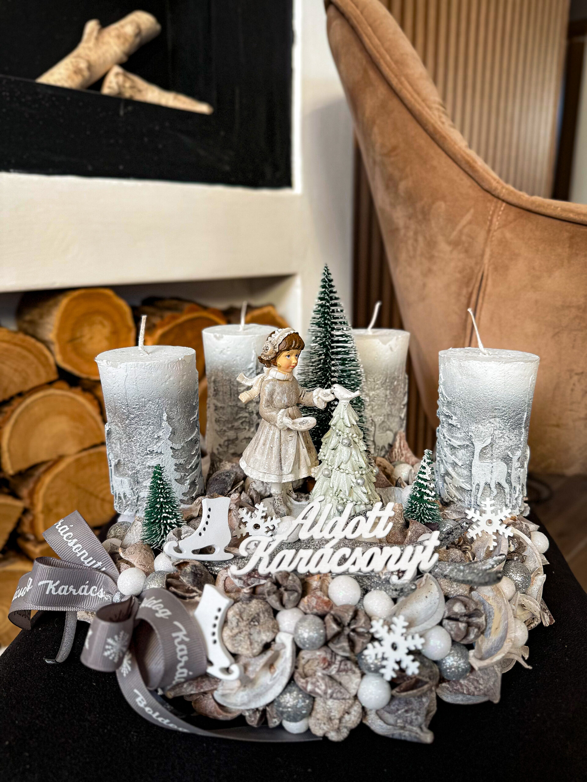 Letisztult, modern ünnepi asztaldísz. Varázsold otthonodba a tél eleganciáját ezzel a különleges, kézzel készült adventi koszorúval, amelyet prémium minőségű, ezüst-szürke-fehér színvilággal és finom részletekkel alkottam meg. A koszorú központjában egy bájos kislány figura áll, mellette hófödte fenyők, korcsolya- és hópehely díszítik a koszorút. Az adventi gyertyák ezüst-fehér, erdő-mintás prémium gyertyák, minden nappalit meghitt, mesés ünnepi hangulattal töltenek meg.