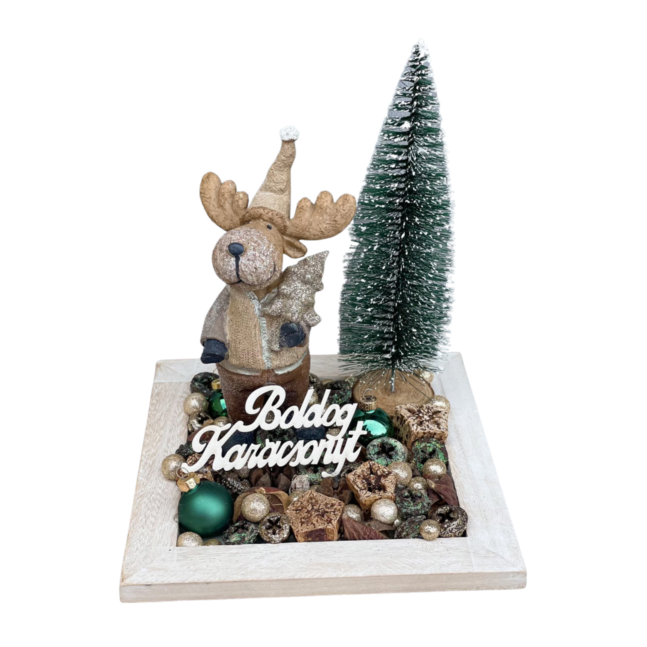 Téli hangulatú asztaldísz szarvas és fenyőfa figurával. Kézzel készült, tartós alapanyagokból.