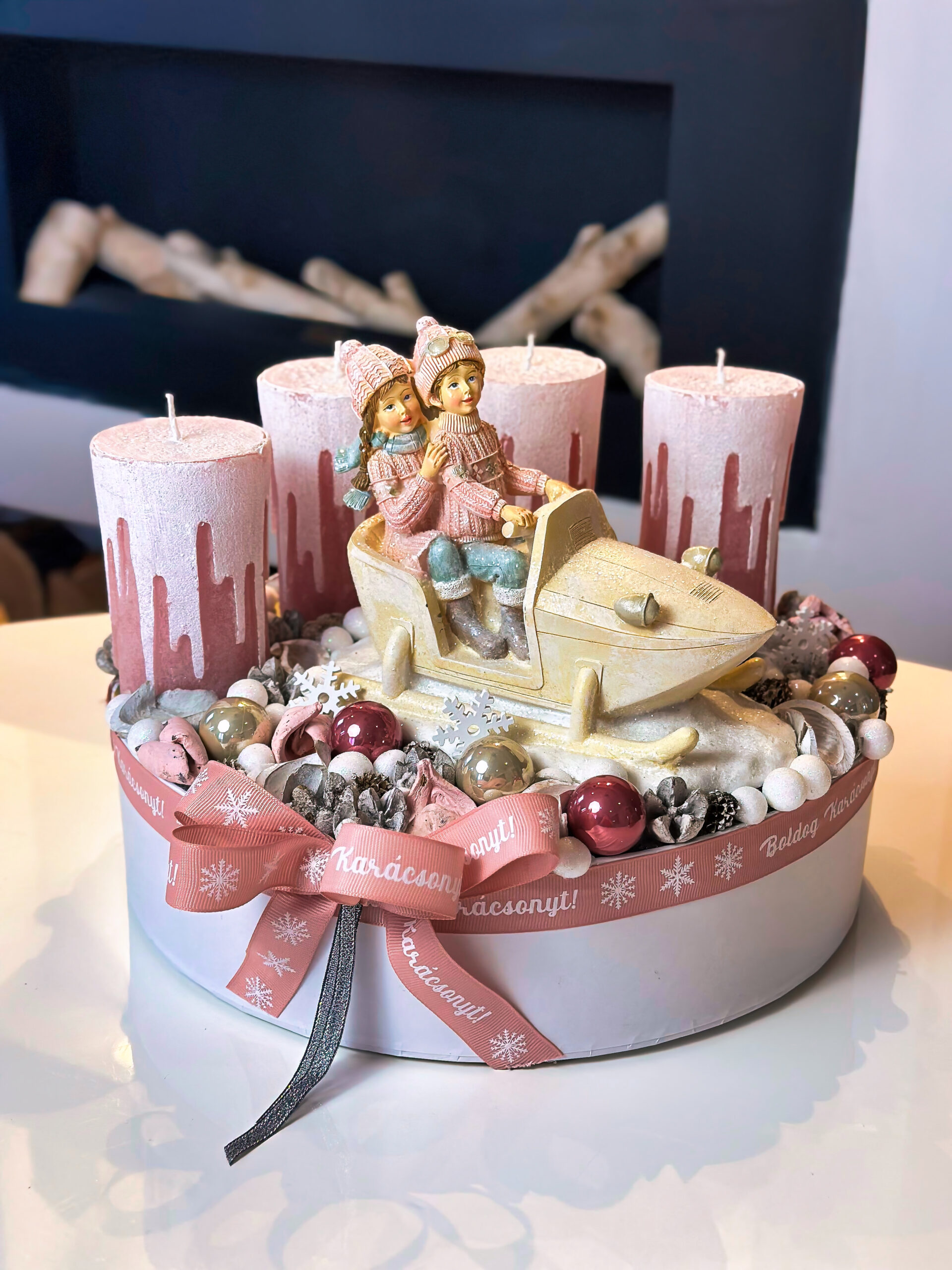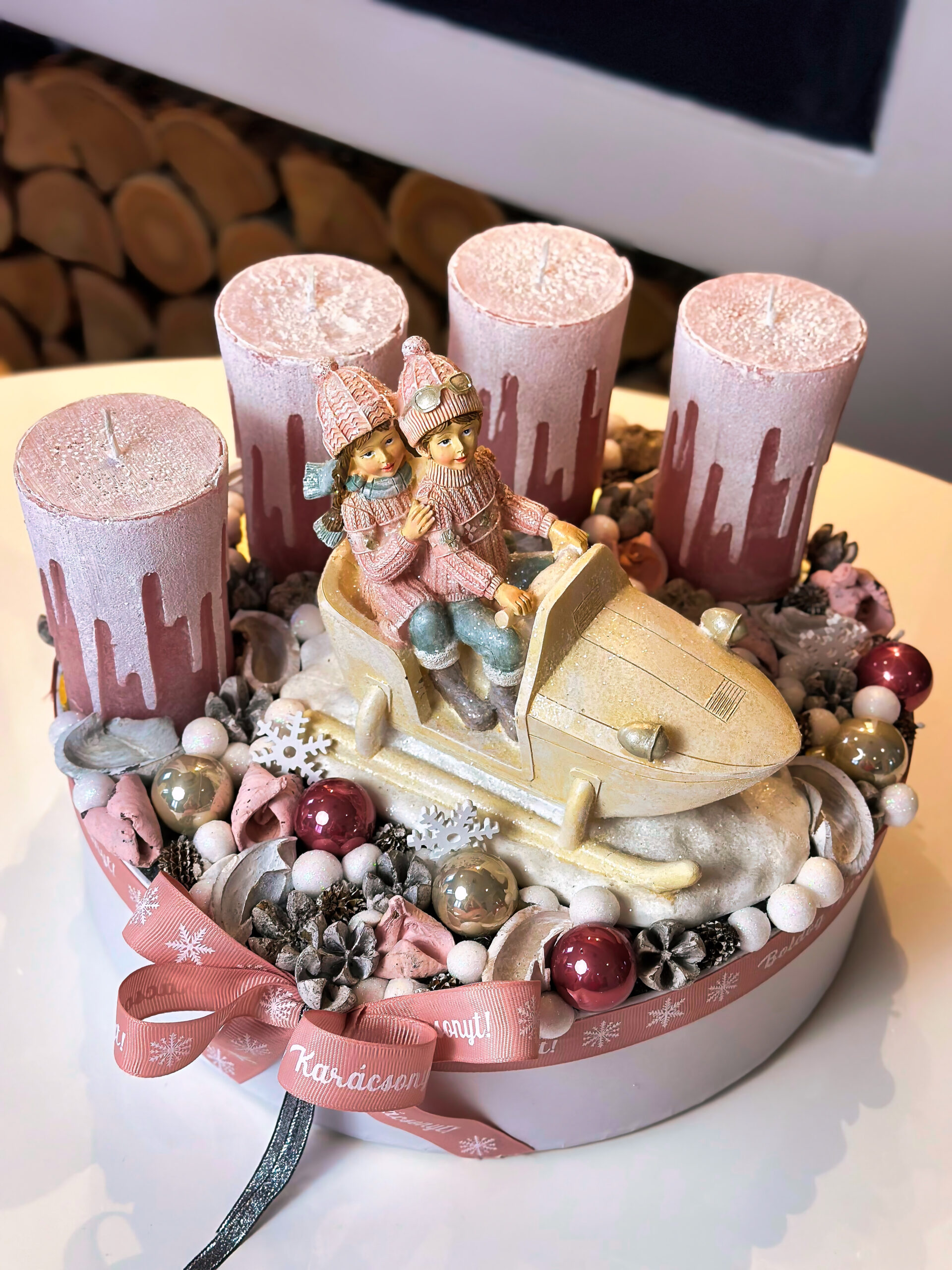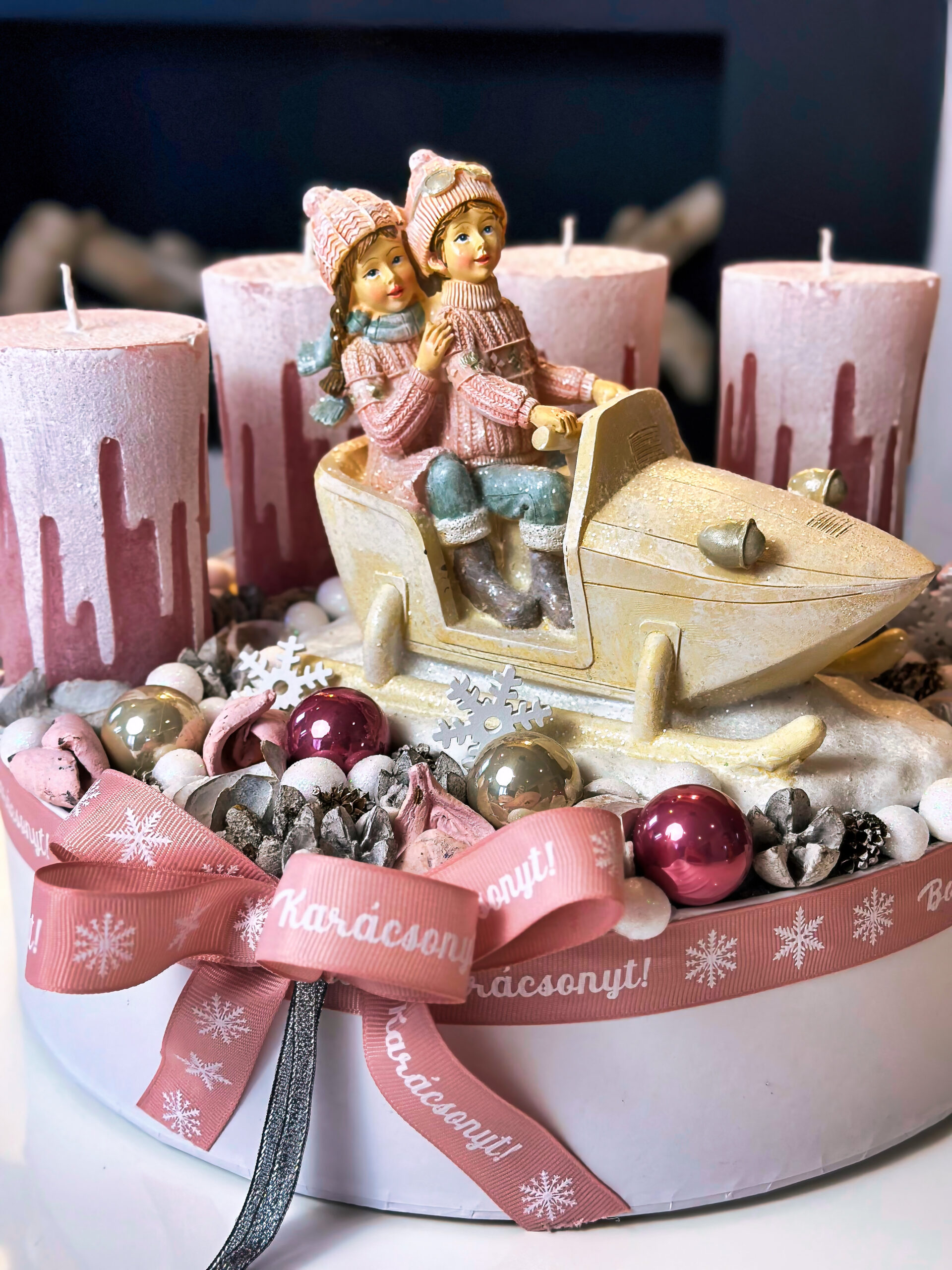 Kézzel és szeretettel készített mályva rószaszín adventi box bob szánkón ülő gyerekeket ábrázoló figurával. Nagy, prémium gyertyákkal díszítve. Fehér karton doboz alapra készült. Csak egyetlen egy darab készült belőle!