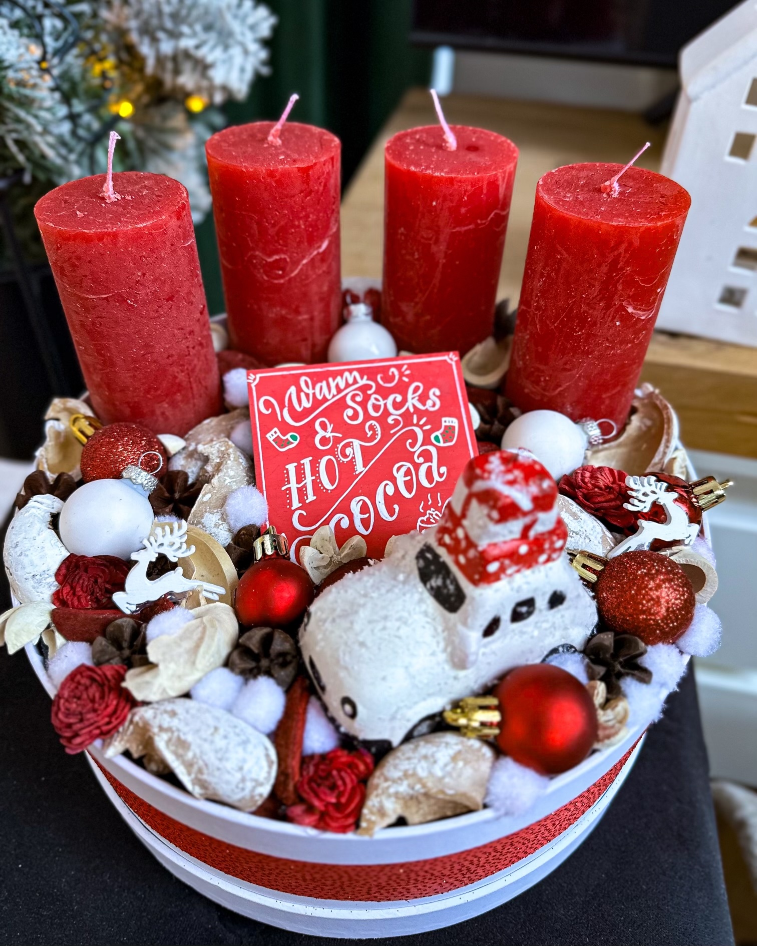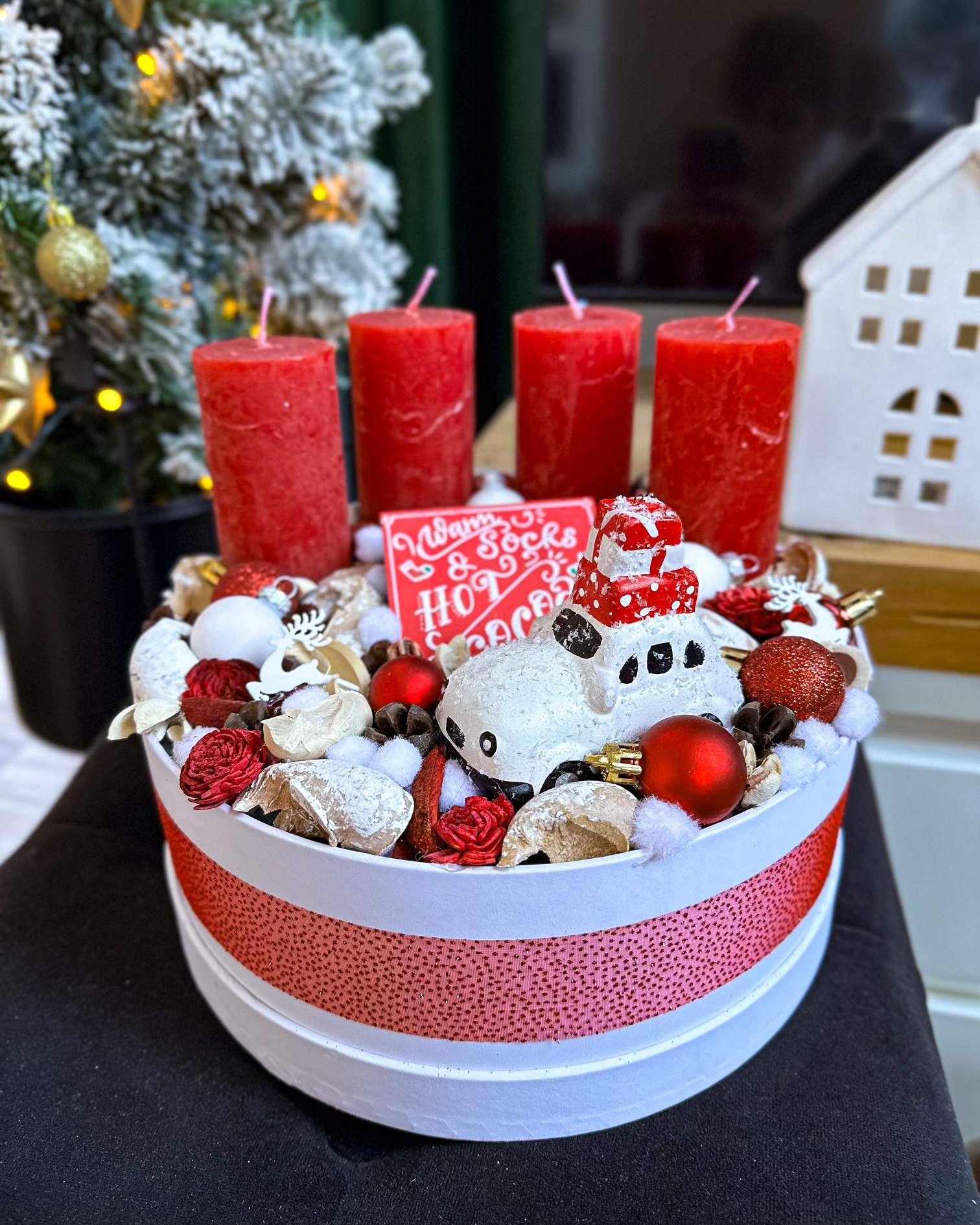 Fehér karton doboz alapra készített adventi box piros gyertyákkal és kisautó figurákkal.