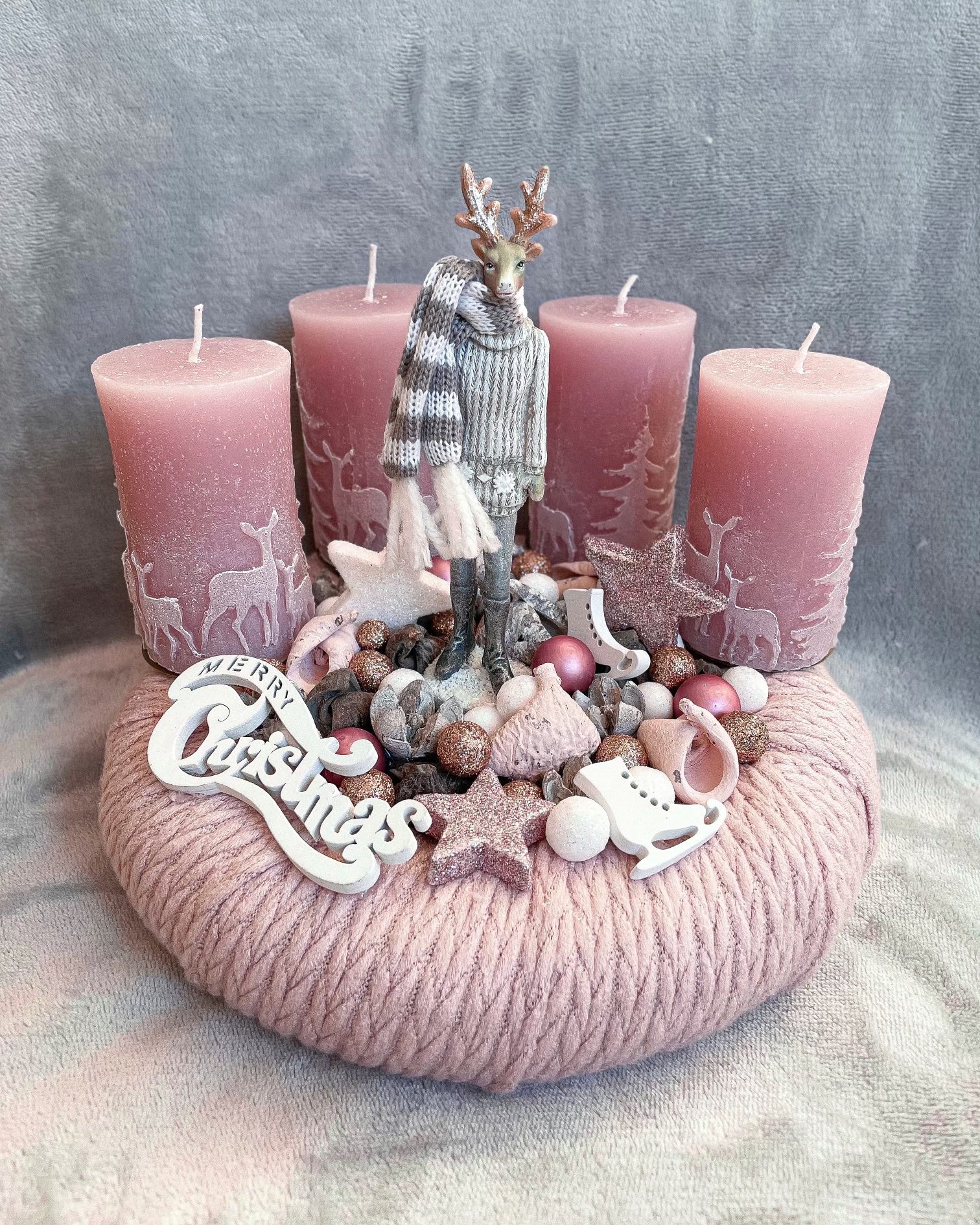 Csodaszép, kézzel készült rózsaszín adventi koszorú szarvas figurával.