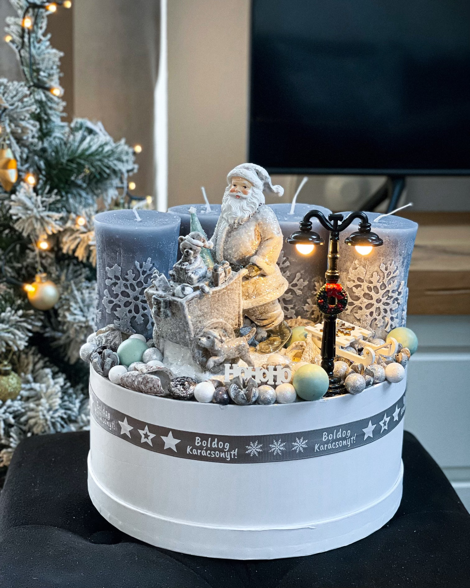 Csodaszép világító adventi box gyertyákkal és mikulás figurával. Kézzel és szeretettel készült. Az utcai lámpa figurát lehet rajta felkapcsolni. 2 darab AA elemmel működik (tartozék).